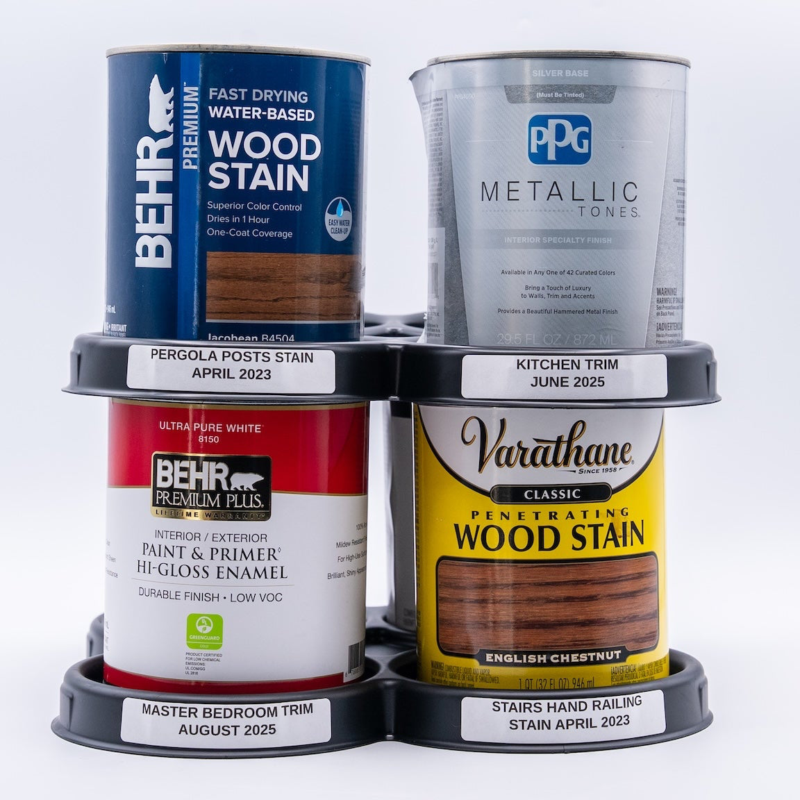 The Paint Organizer — the ultimate storage solution for DIY homeowners and professional painters. This patented, heavy-duty paint can storage organizer prevents splatters, drips, and rust rings. Made from eco-friendly recycled plastic, it's durable and makes sorting easy by color, size, brand, or location. Holding up to 4 cans — perfect for home, workshop, and job site projects. Keep your space clean, organized, and efficient.